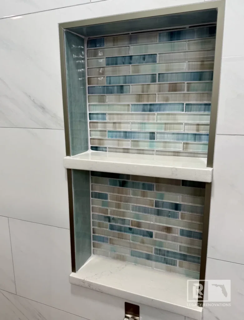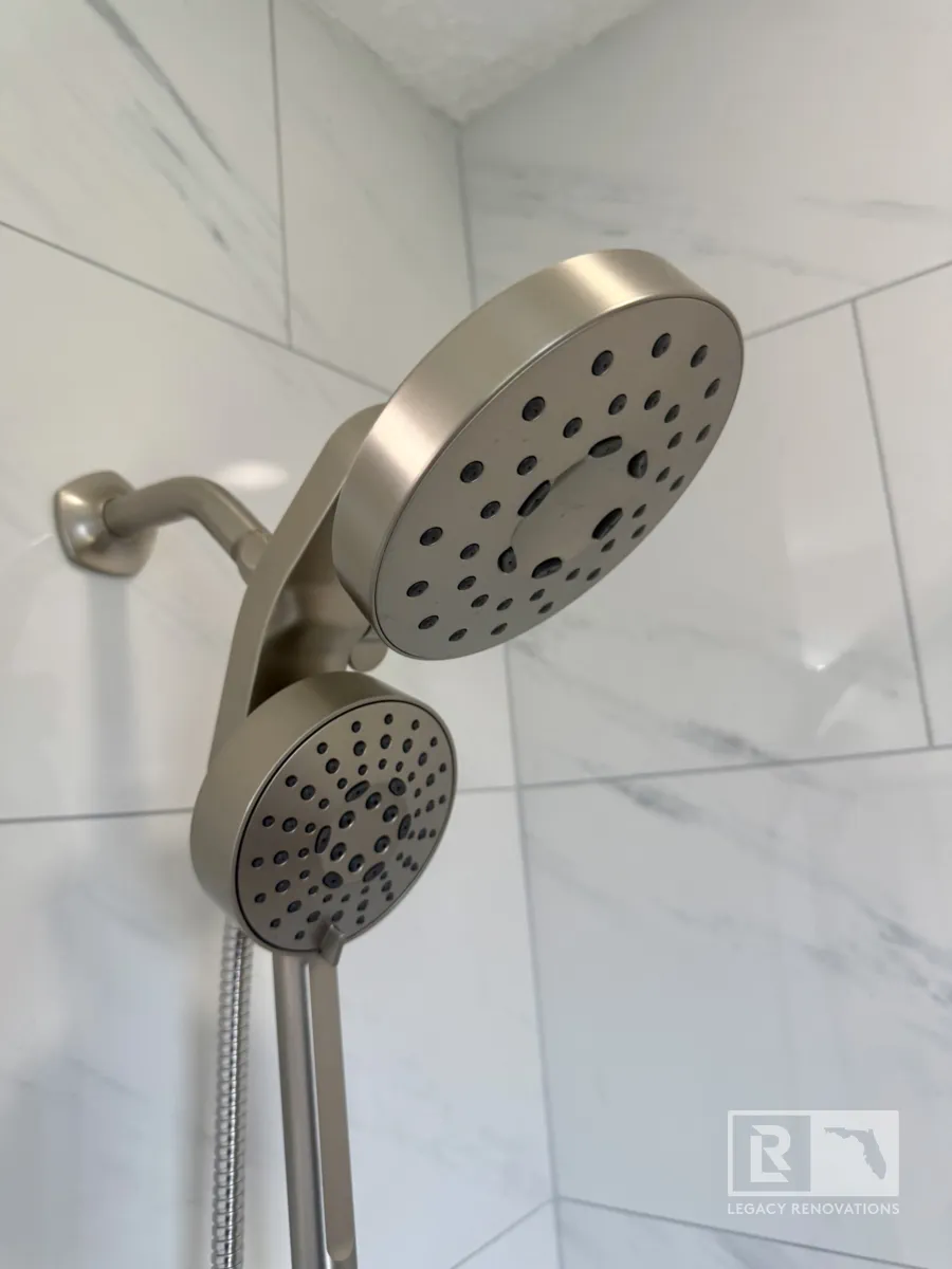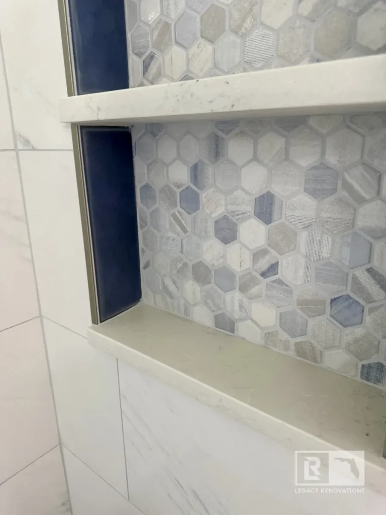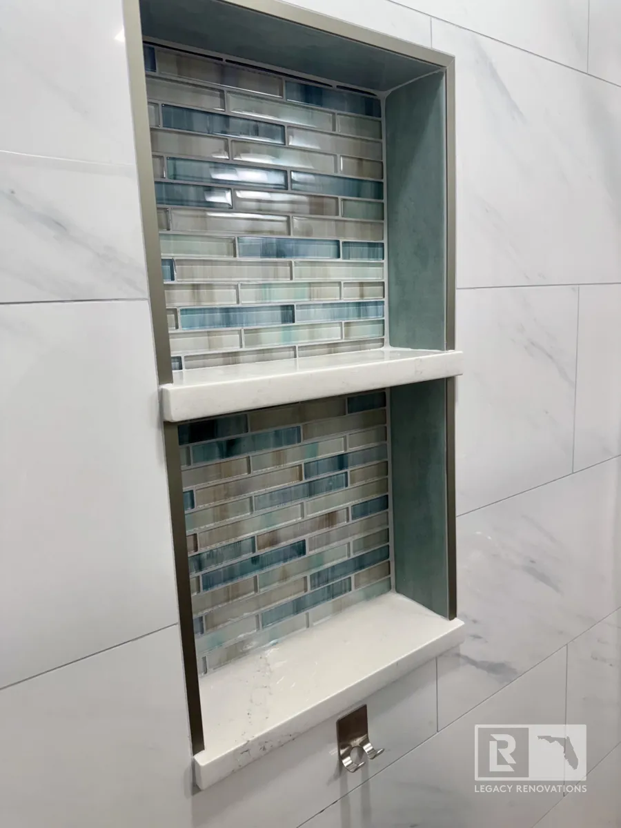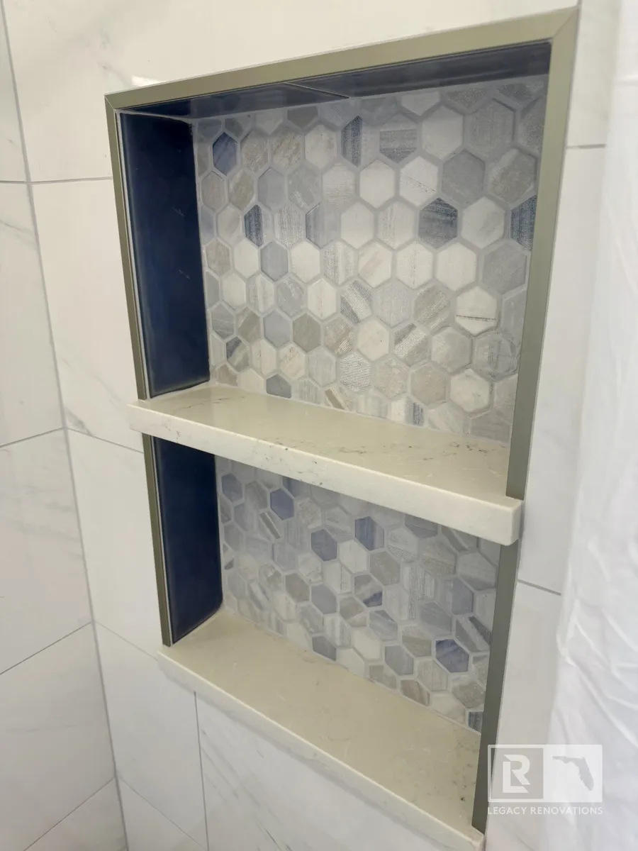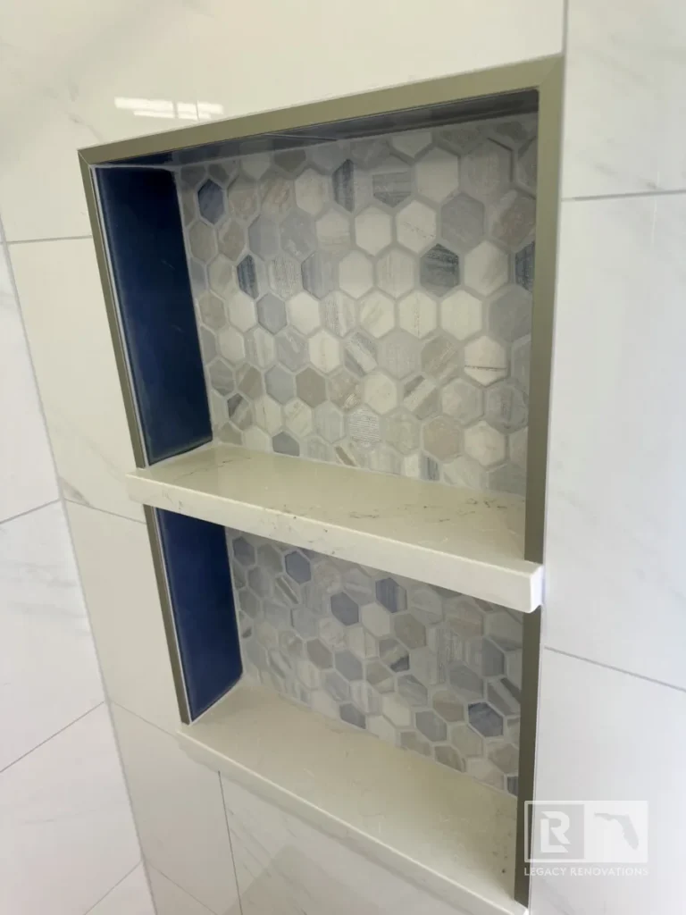 As part of our standard process, every custom shower pan we install undergoes a 24–48 hour water test to guarantee a perfect seal. We used custom stone across both bathrooms, incorporating it in the niche base, threshold, and shelving for a cohesive, premium look. A second shelf was added to maximize storage and enhance usability within the shower.