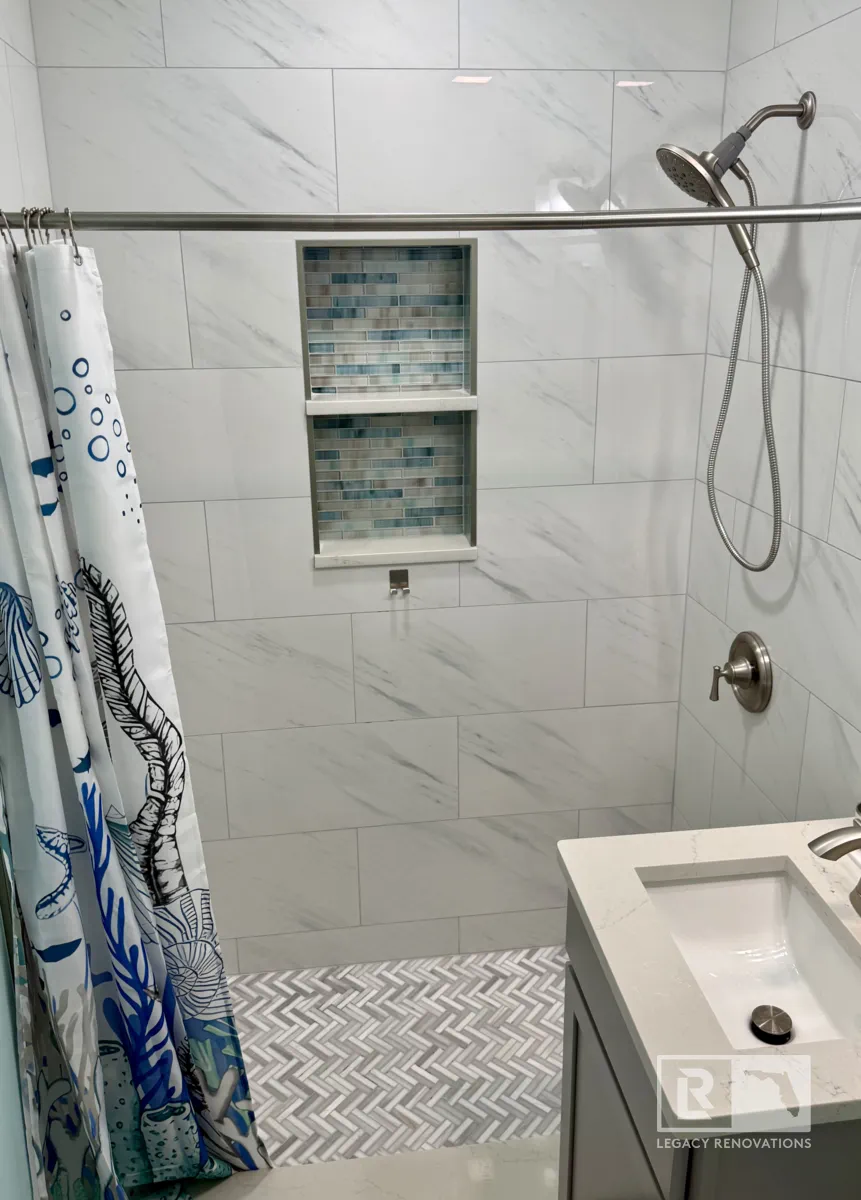 Instead of glass, the client opted for a shower curtain setup to maintain a more open feel — ideal for the small layout. With new plumbing fixtures, updated valves and spouts, and improved water pressure, the shower experience is now significantly better than before.