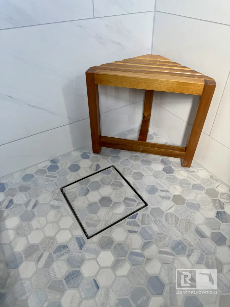 The space, though compact, now features a stunning new design centered around beautiful custom tile work. Originally, the bathroom had a tub, which we fully removed to create a more modern, open shower area. The entire space was stripped down to the studs and completely waterproofed, ensuring long-term durability and protection.