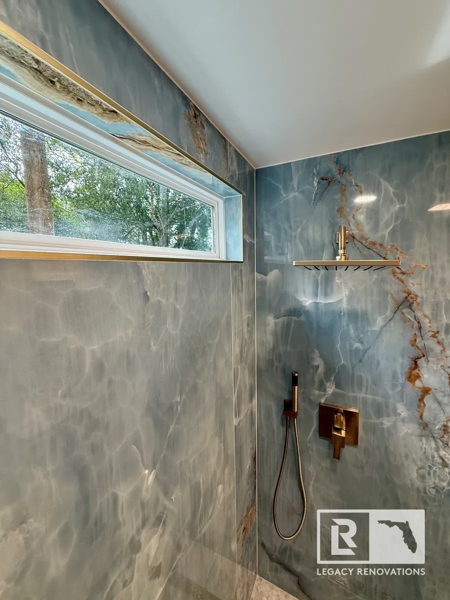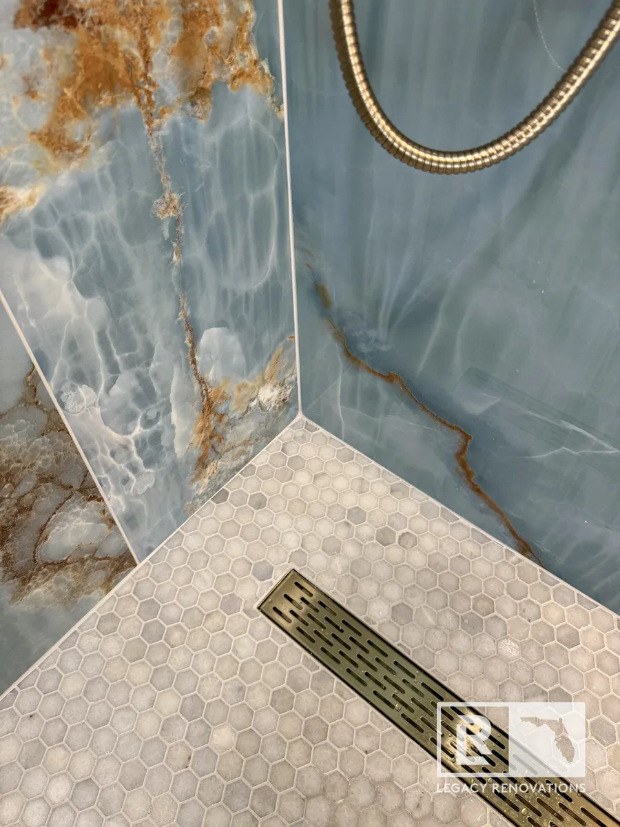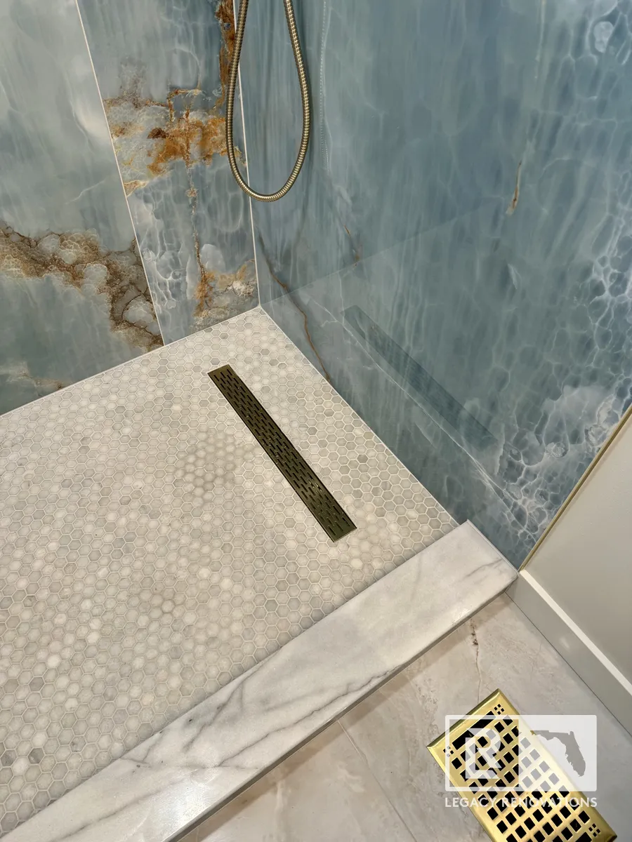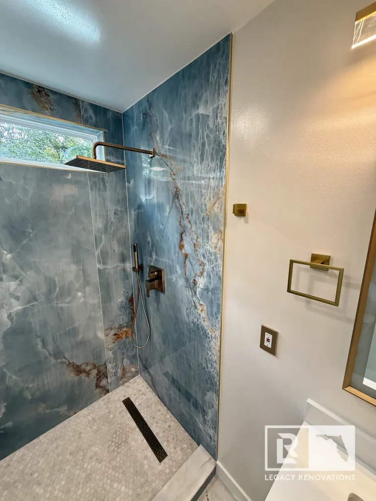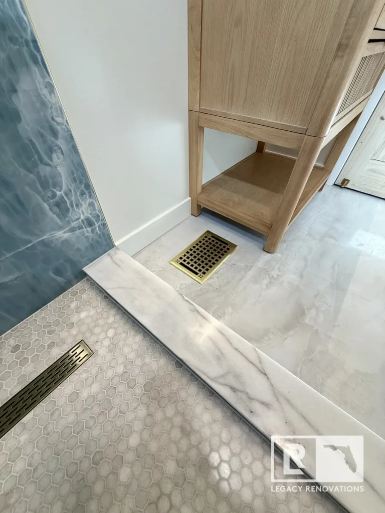 We went with the linear drain and then gold, all the accessories and all the trim, all the Schluter edges is all gold. The blue and the gold are great complimentary colors that turn out absolutely beautiful. And then kept with the same design on the floor. You can see we went with really large tiles just to limit the amount of grout lines there were. The duct work was running underneath. So we had to change the location of that so that it fit with the bathroom. A lot of stuff we ended up changing and running new lines, older wiring. We ran new lines for the mirror.
