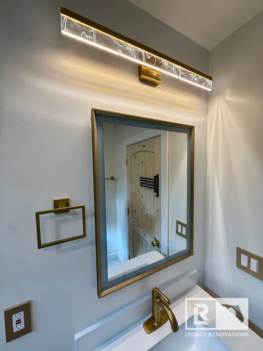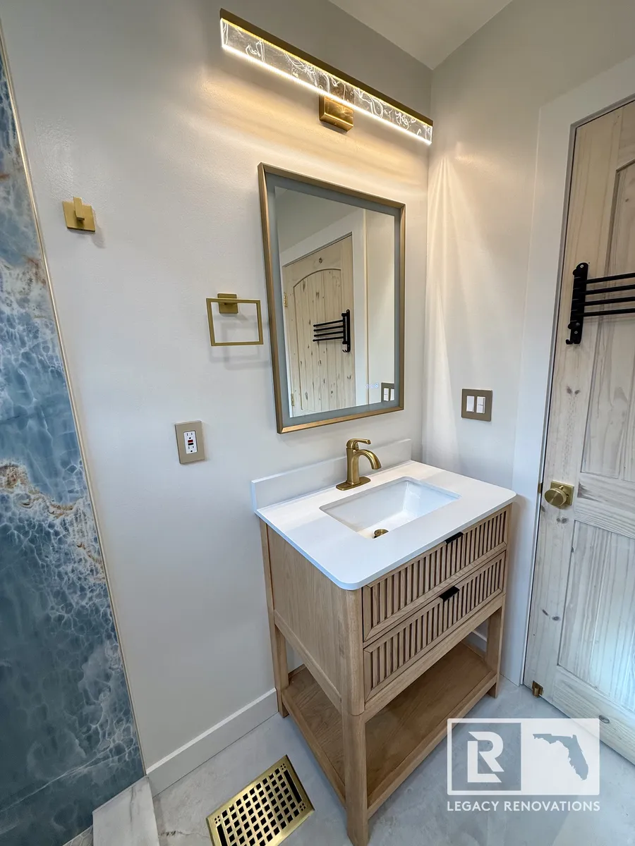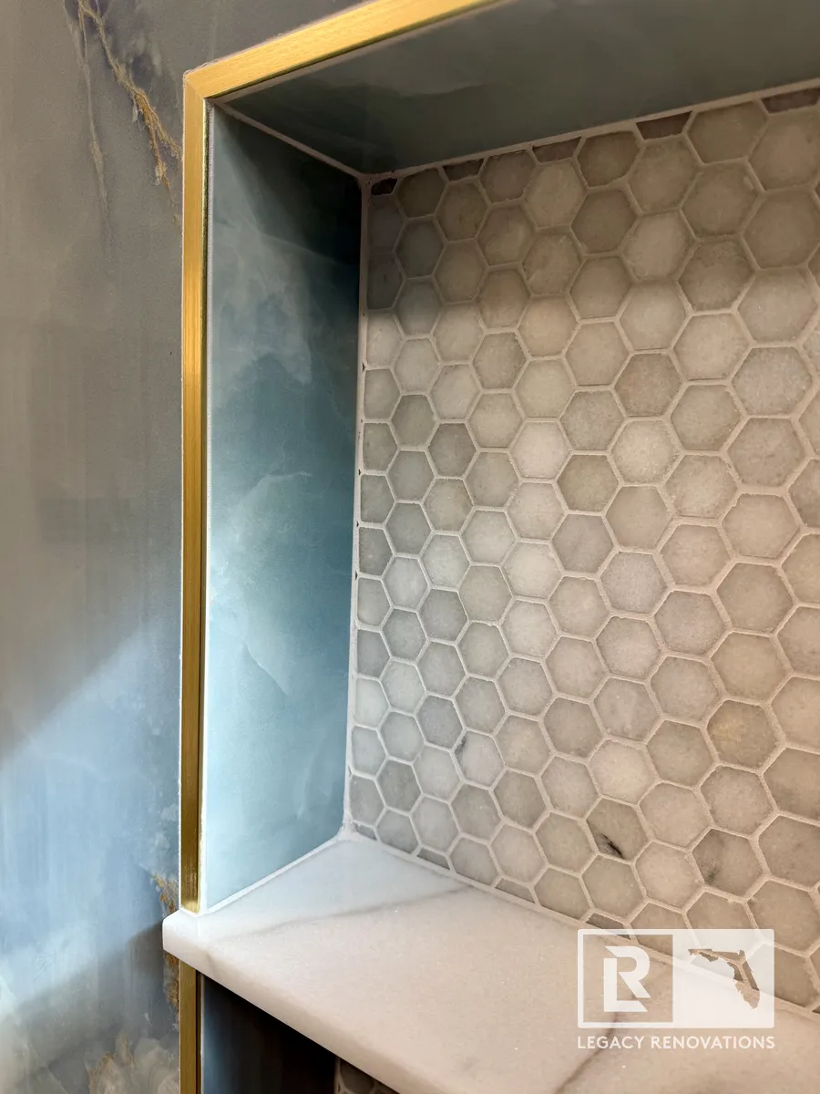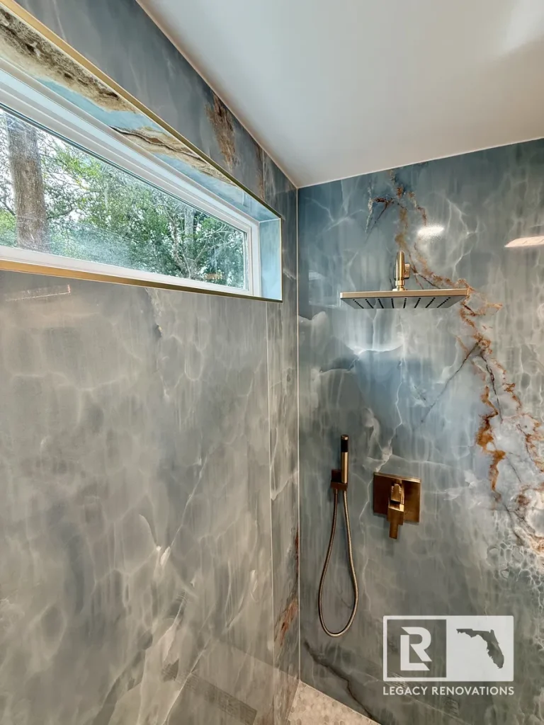 We went with the linear drain and then gold, all the accessories and all the trim, all the Schluter edges is all gold. The blue and the gold are great complimentary colors that turn out absolutely beautiful. And then kept with the same design on the floor. You can see we went with really large tiles just to limit the amount of grout lines there were. The duct work was running underneath. So we had to change the location of that so that it fit with the bathroom. A lot of stuff we ended up changing and running new lines, older wiring. We ran new lines for the mirror.