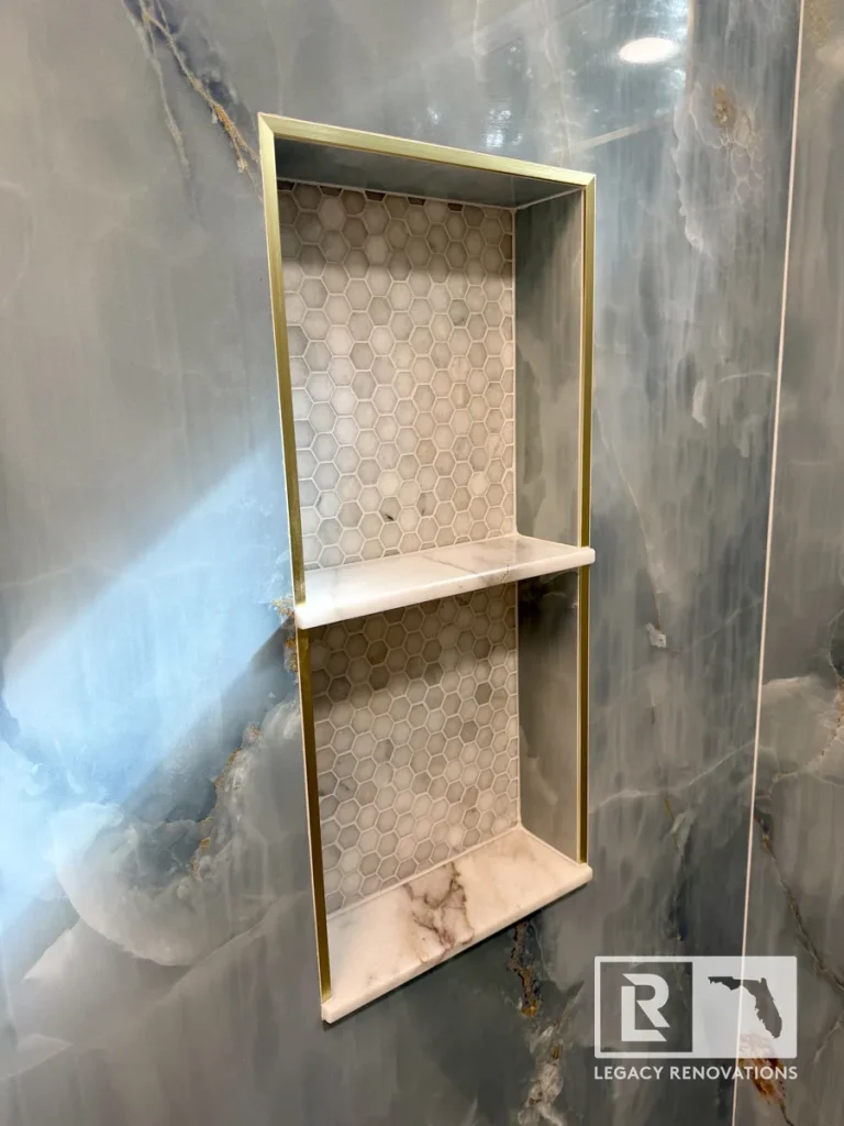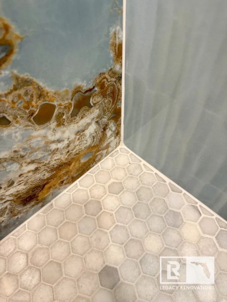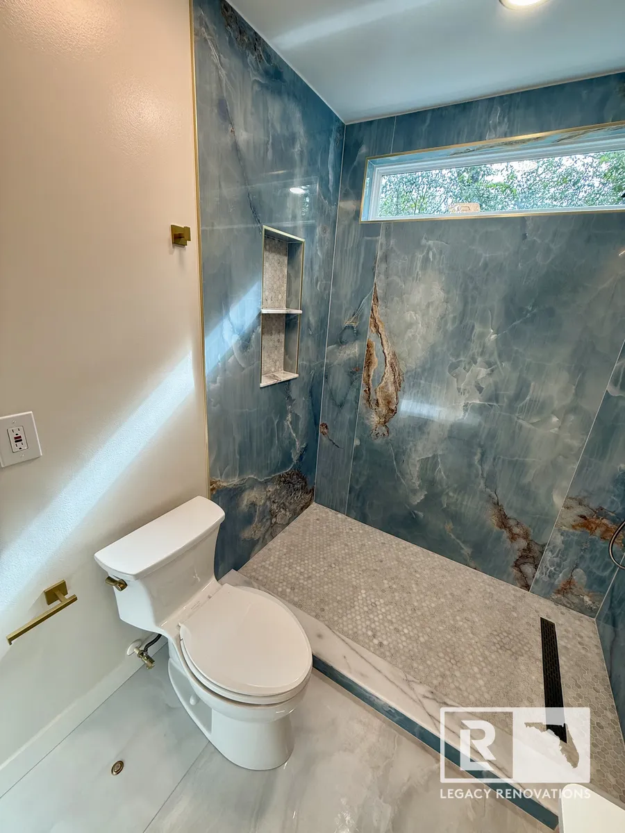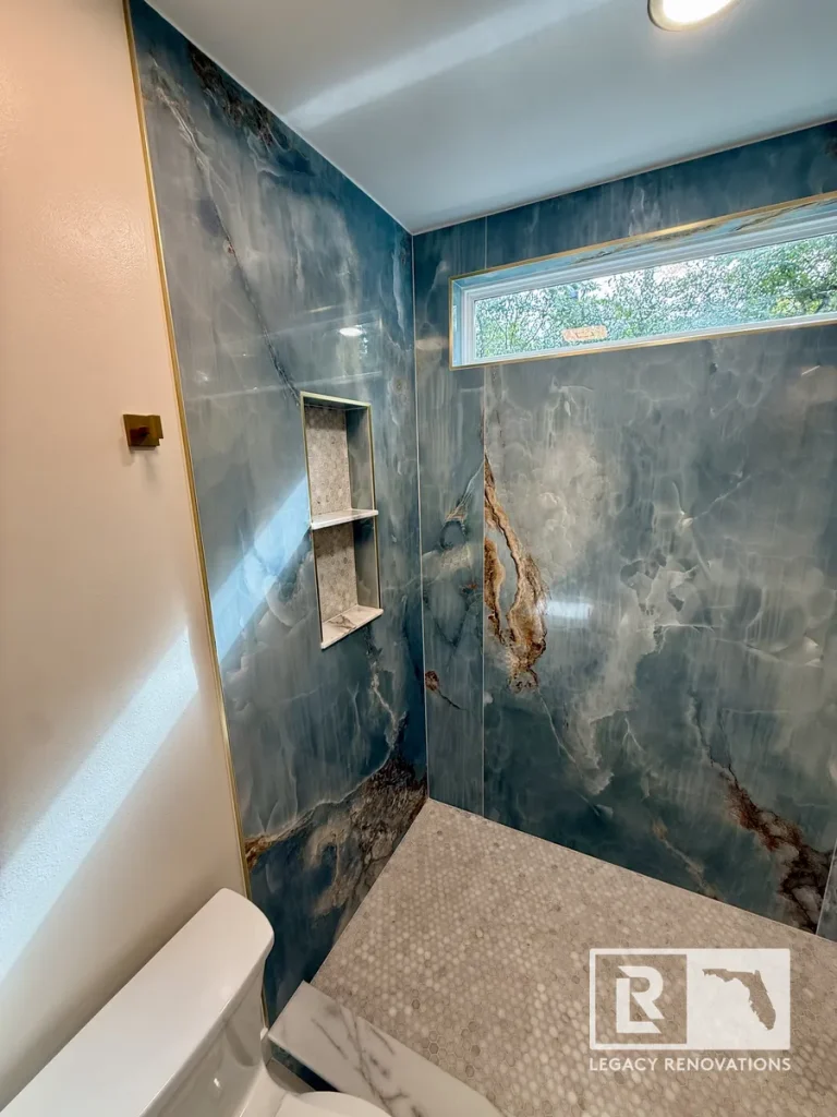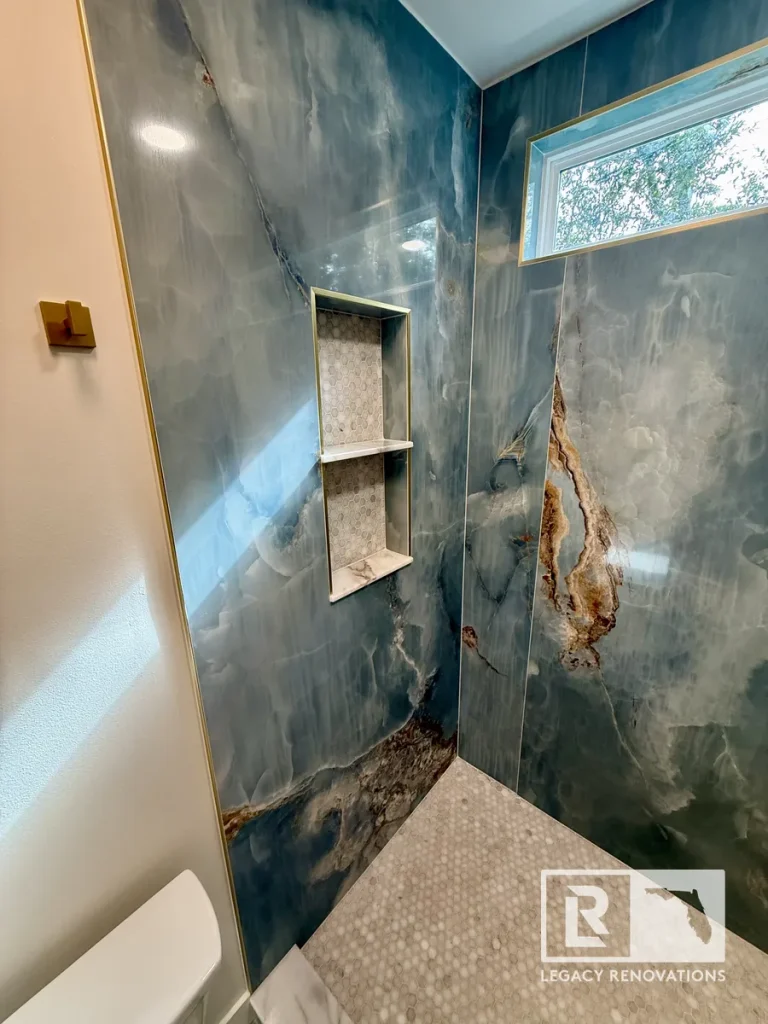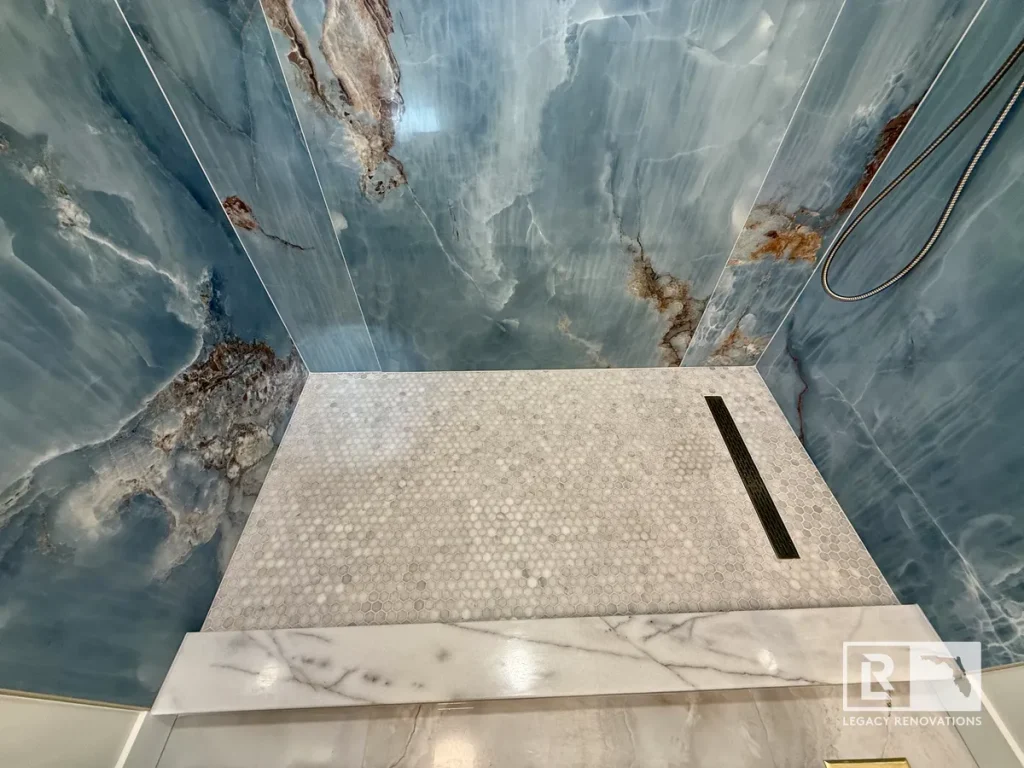 One of the key features of this bathroom is these large 48″ x 111″ Onyx Azul / Blue Onyx porcelain tiles, People that don’t like grout lines, these four foot by nine foot tiles are the way to go. It’s expensive and the cuts have to be very precise, but as long as you take the time and you’re very, very precise with everything, then it can turn out absolutely beautiful. Again, with all of our bathrooms, we match the back of the niche with the shower floor.