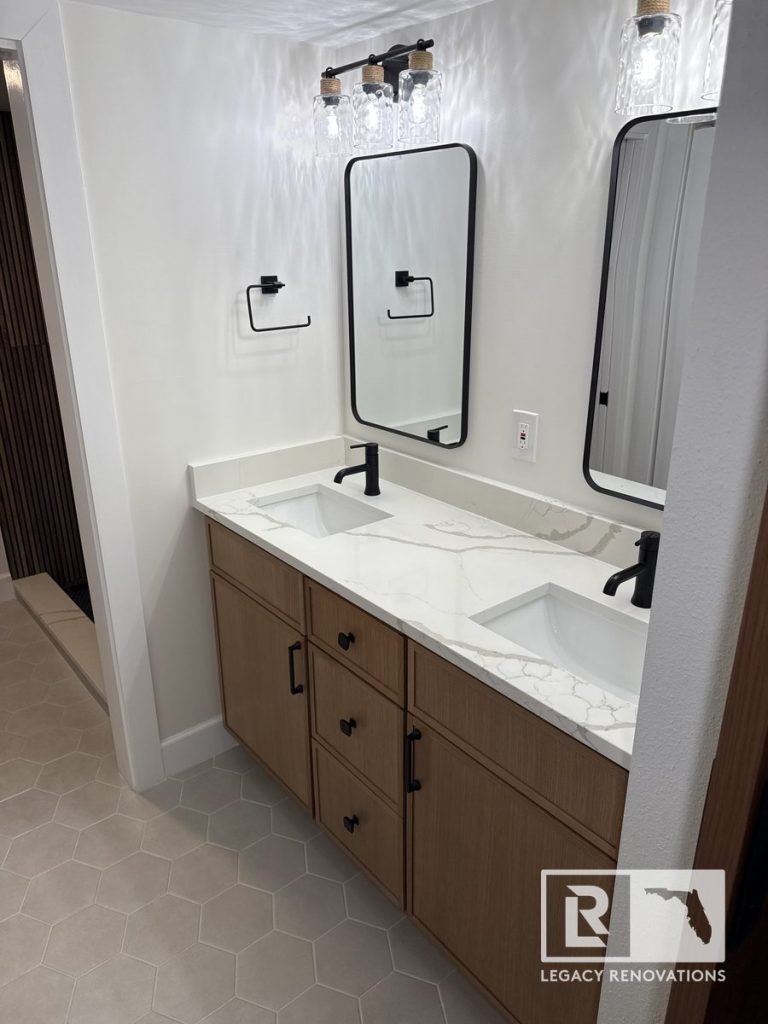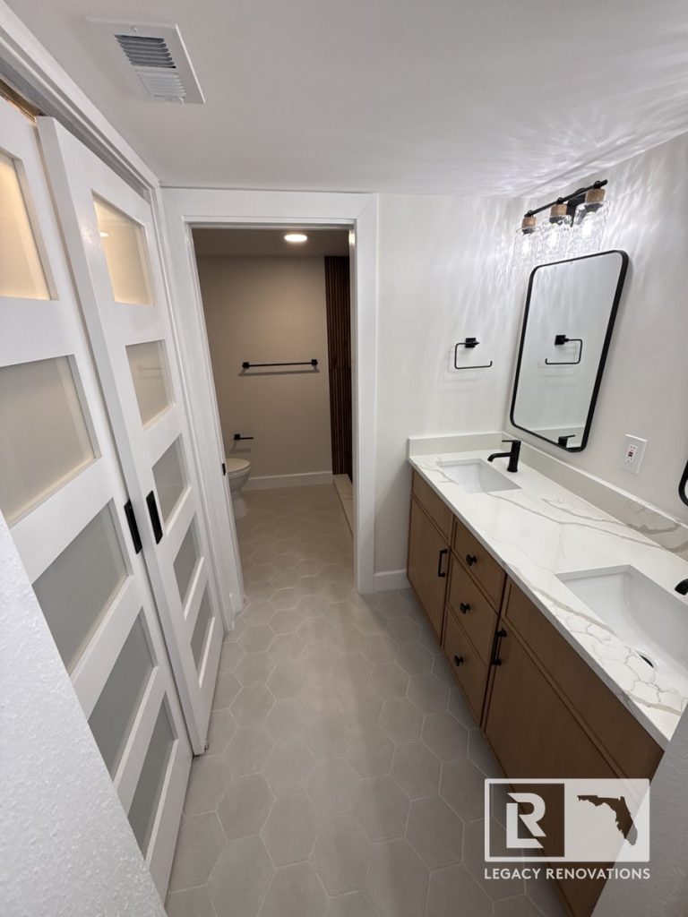 The design has a strong beachy feel, which was intentional — the ocean is just a block away. We leaned into that with black trim throughout, carried across the mirrors, lights, and fixtures. On the vanity side of the bathroom, slider doors provide closet space, and where a traditional door once stood, we installed a pocket door to save space. It matches the other doors in the room, and a linen closet alongside it adds convenient storage.