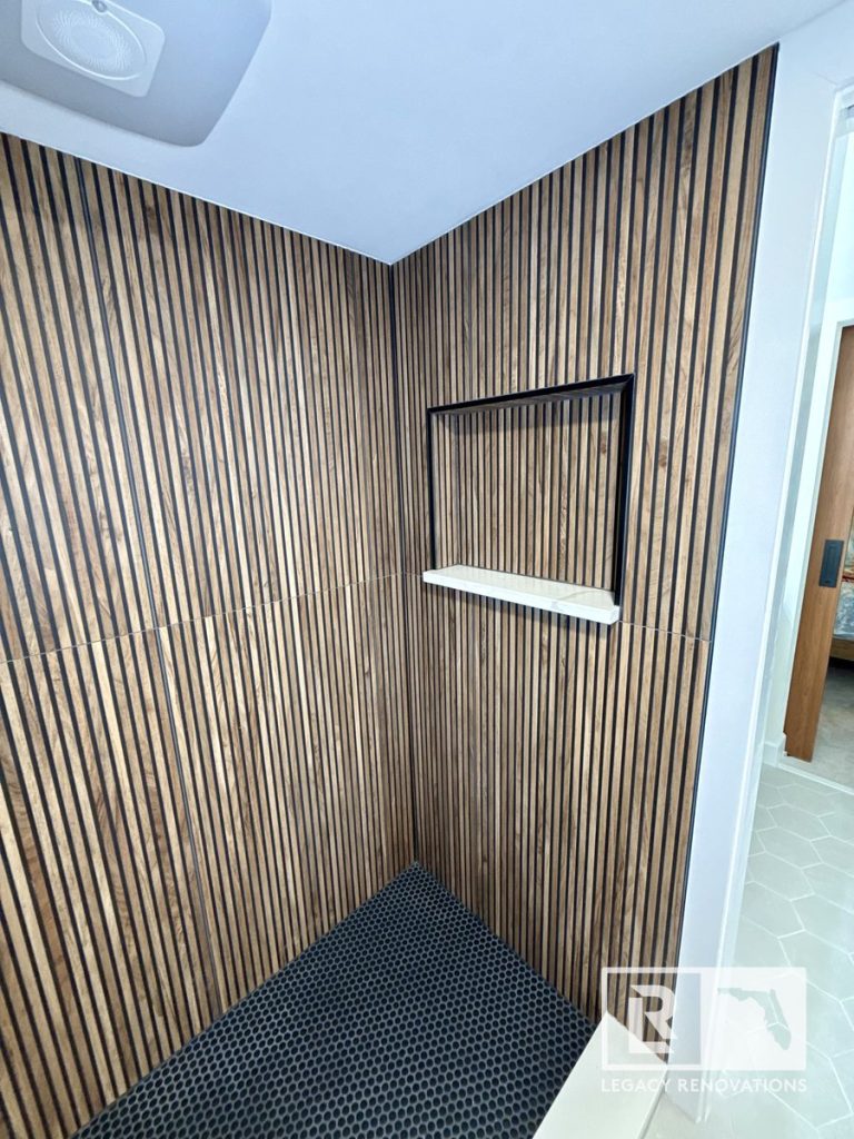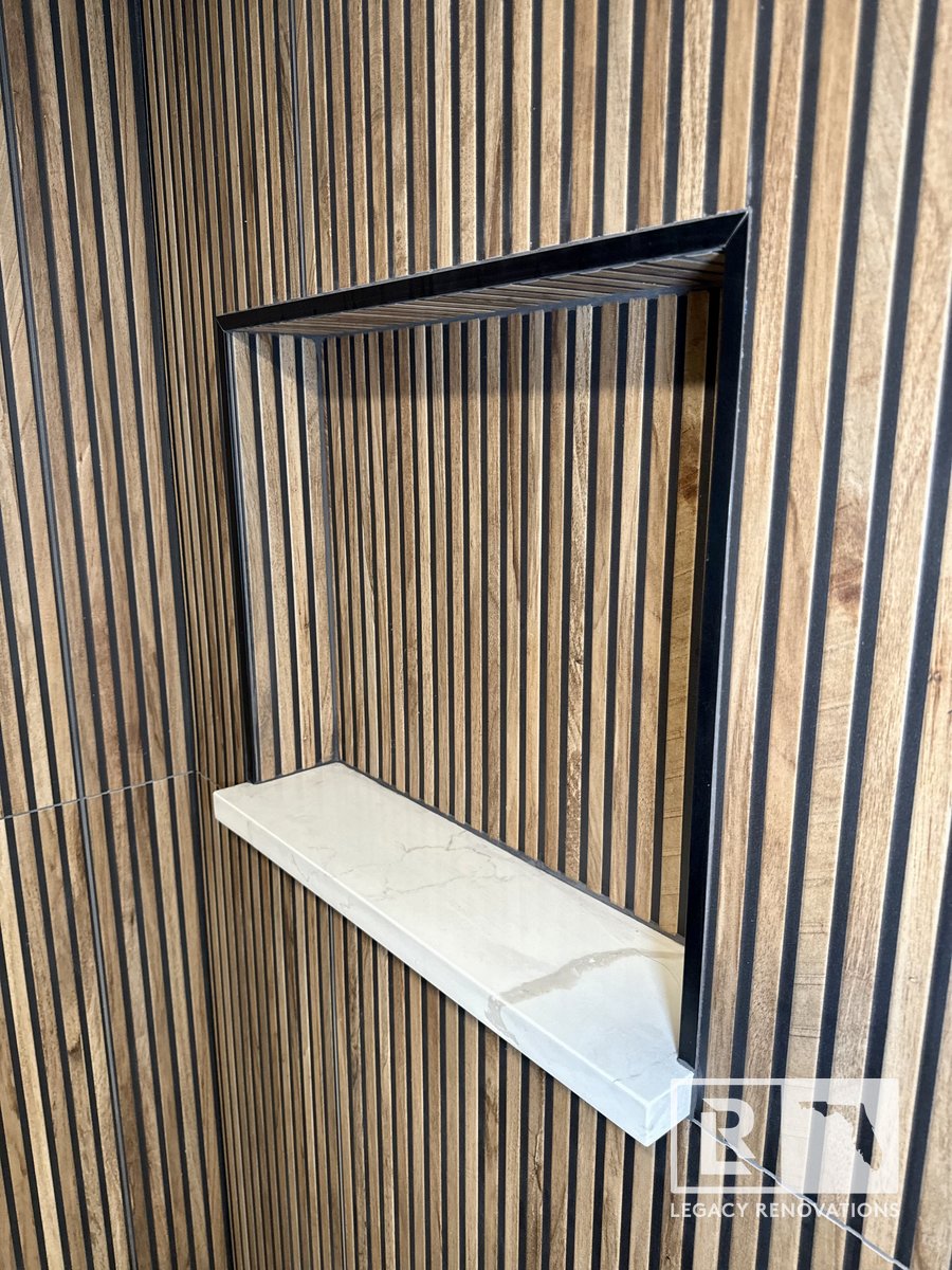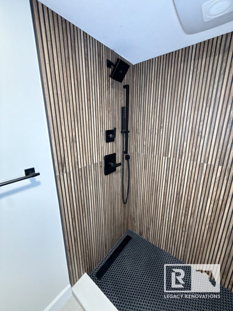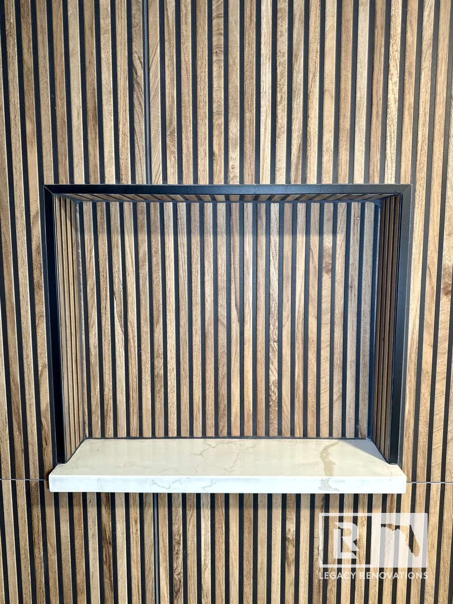 As we do in all of our bathrooms, we used the same stone on the vanity top and niche bases to tie the whole space together. The black, brown, and natural tones mesh seamlessly — exactly what the homeowner wanted. We’d love to do something like this for you. Give us a call at Legacy Renovations.