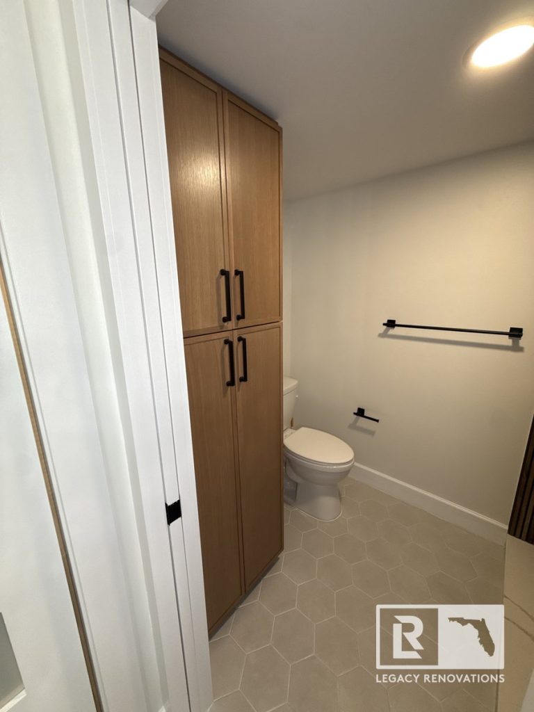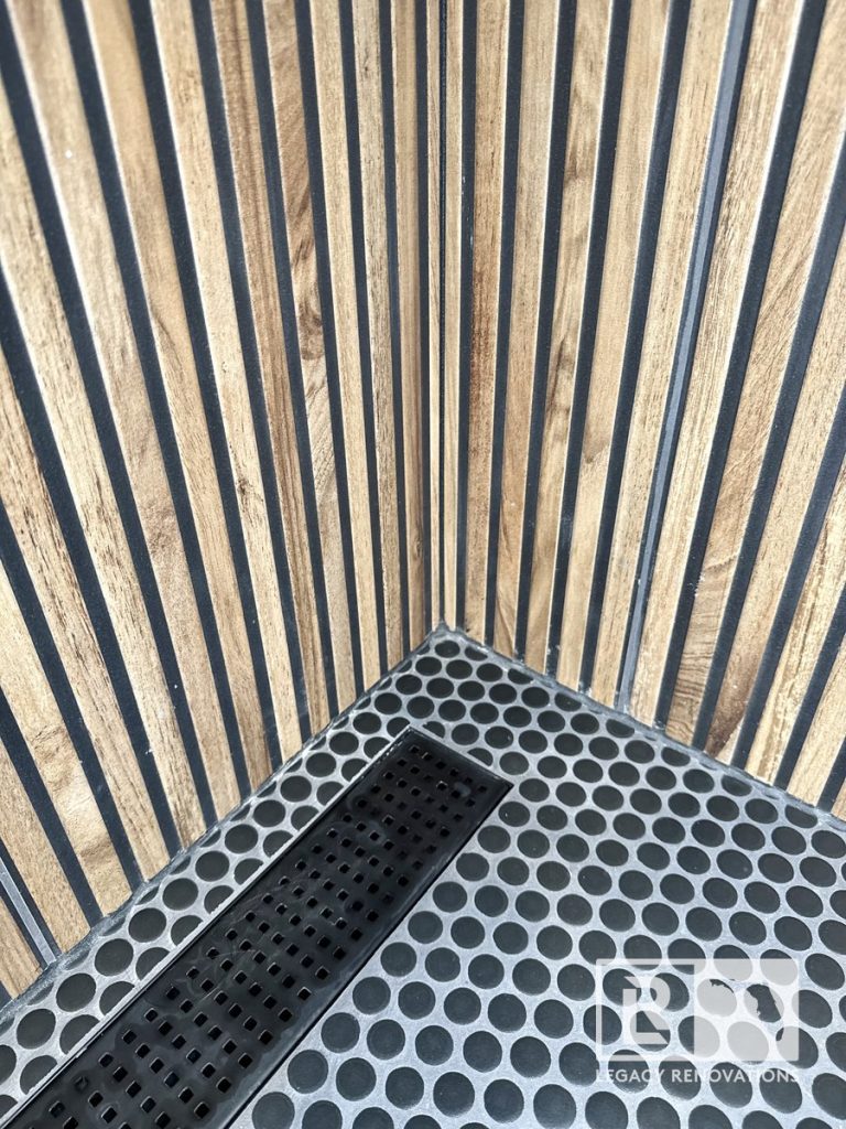 The previous contractor had already relocated the toilet, so we picked up from there — finishing the tile, installing the toilet, and adding a linen cabinet. The walk-in shower features a linear drain, handheld fixture, and the same black trim carried throughout. The glass enclosure wasn’t in yet at the time of filming, but was due within the week.
