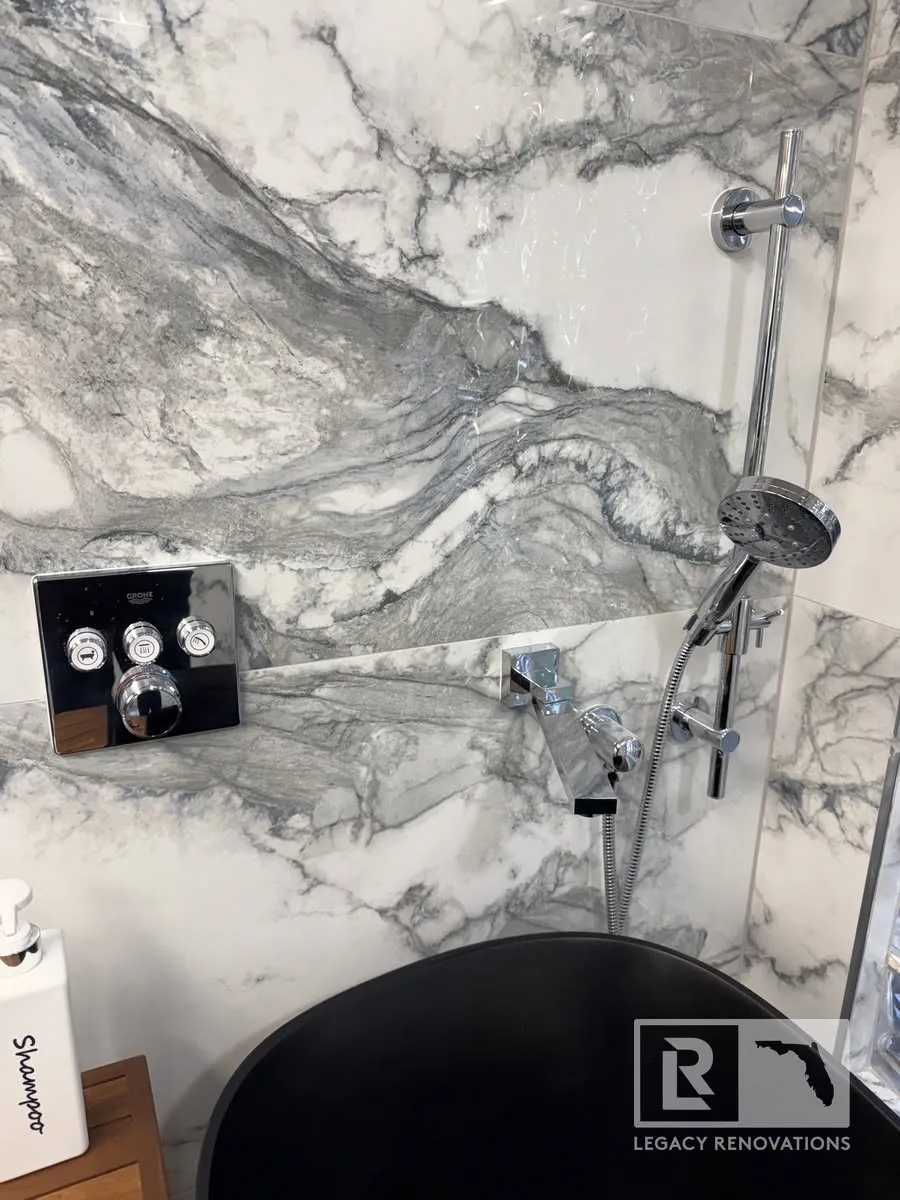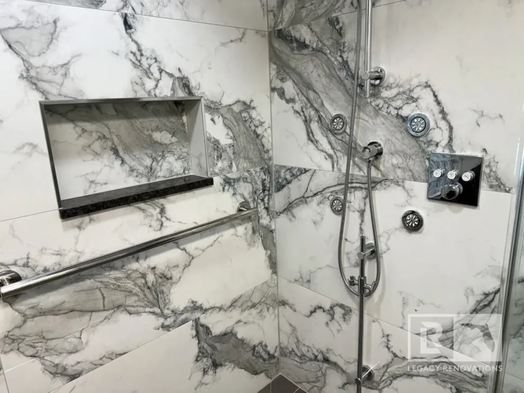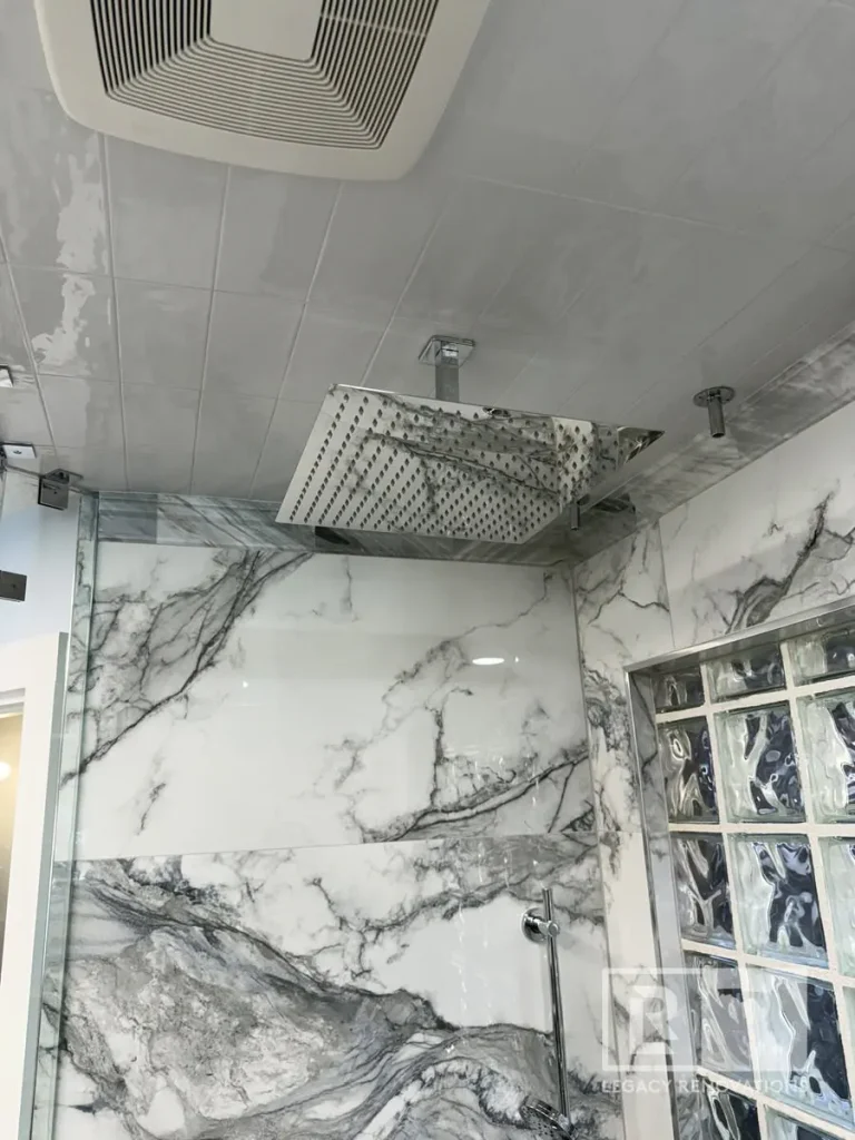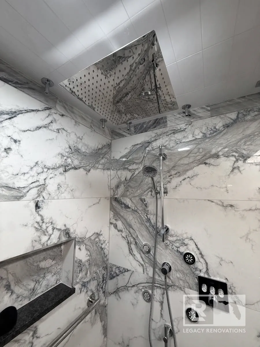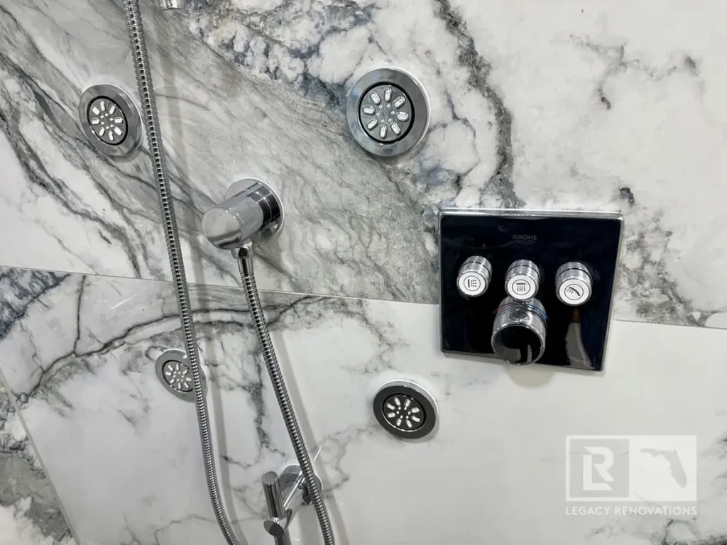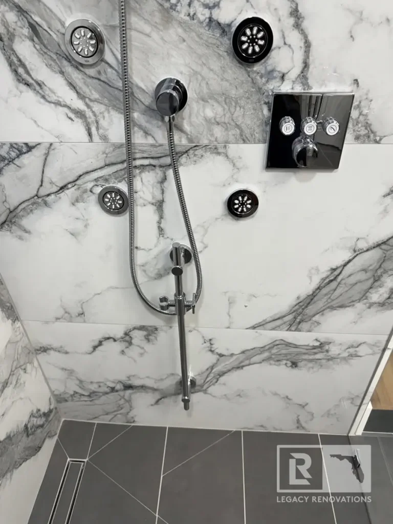 Again, three different ways. We’ve got body sprays, the handheld, and then another rain shower head. All supplied by the Honsgrohe valve system, which is a German brand, super, super good quality, and turned out really, really beautiful.