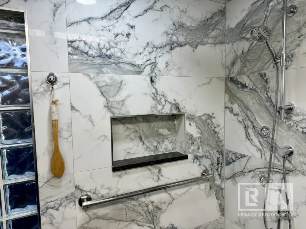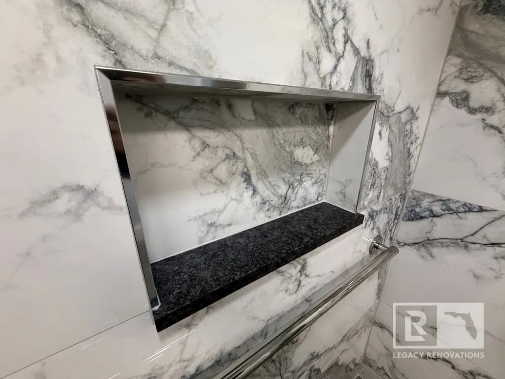 The vanity or the niche, which has the stone that matches the vanity top to, again, just try and blend as much as we can.