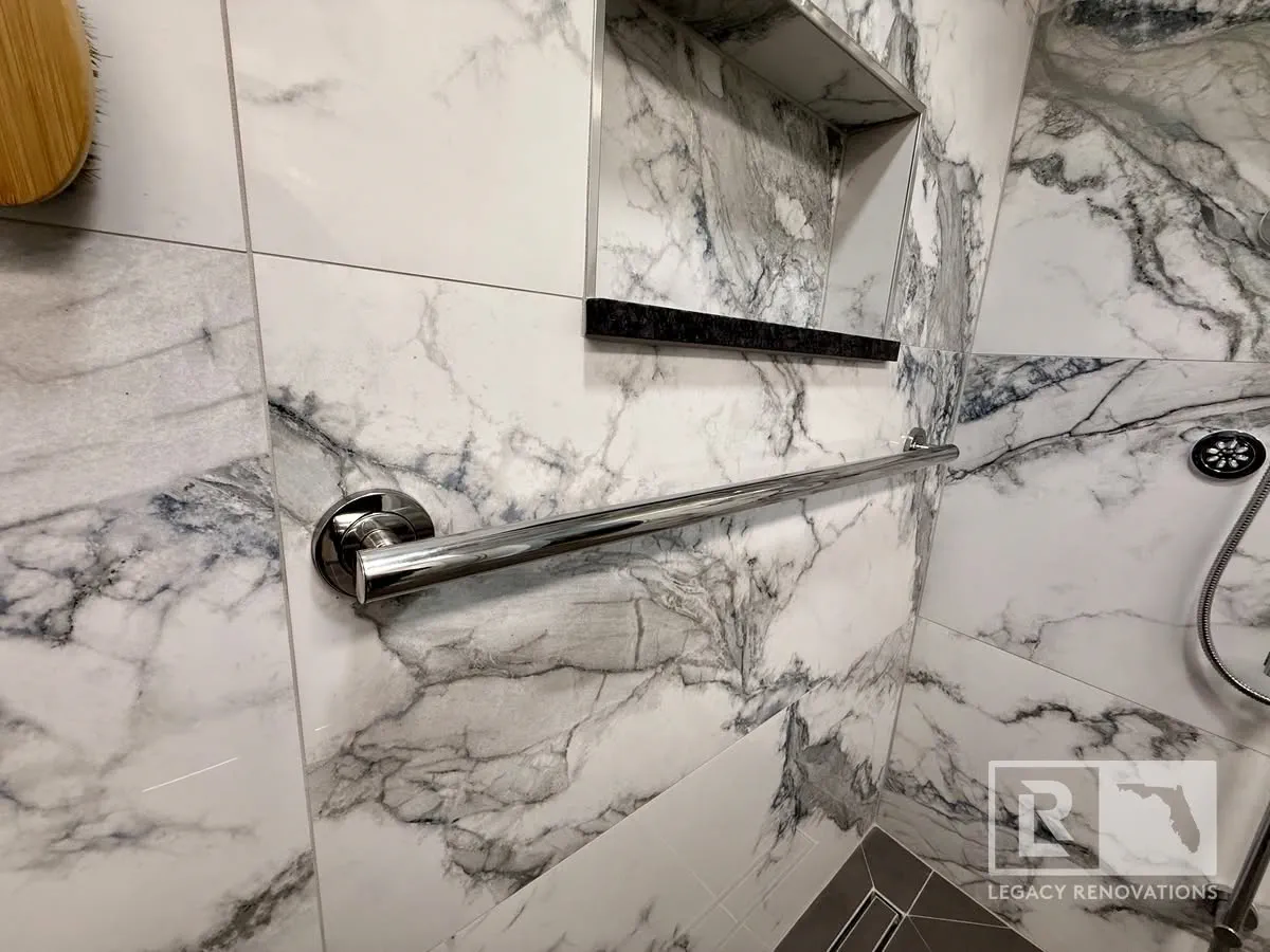 There’s a lot to go over, but the first thing you can see, something we did a little bit different with this bathroom, is we had the same flooring going all the way in the shower.