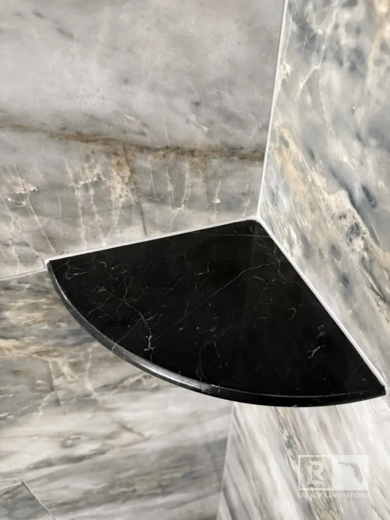 To achieve this, we used the same tile selection and flooring materials as the previous project. The main design adjustment was replacing the niche with elegant corner shelves that complement the overall look. The shower features dark color tones, including black and oiled bronze finishes, paired with a dark marble threshold to enhance its luxurious feel.