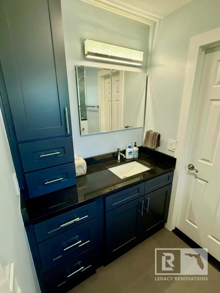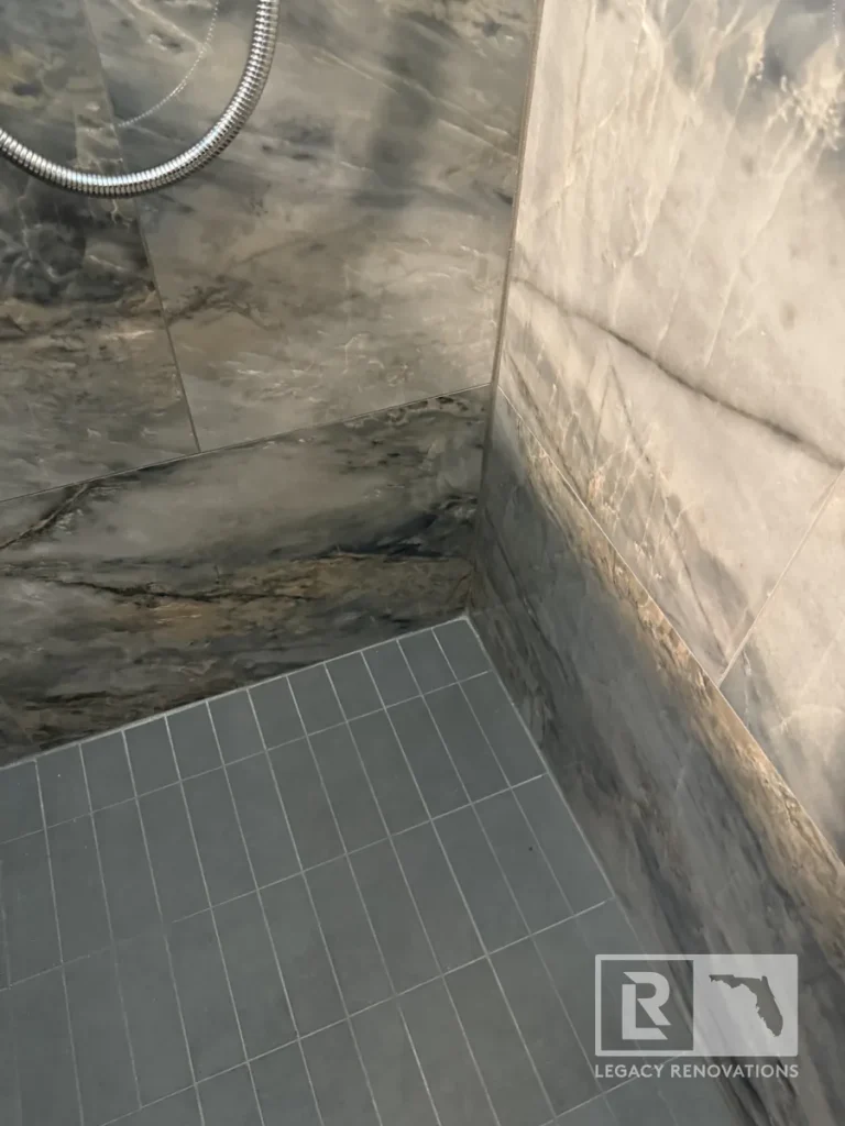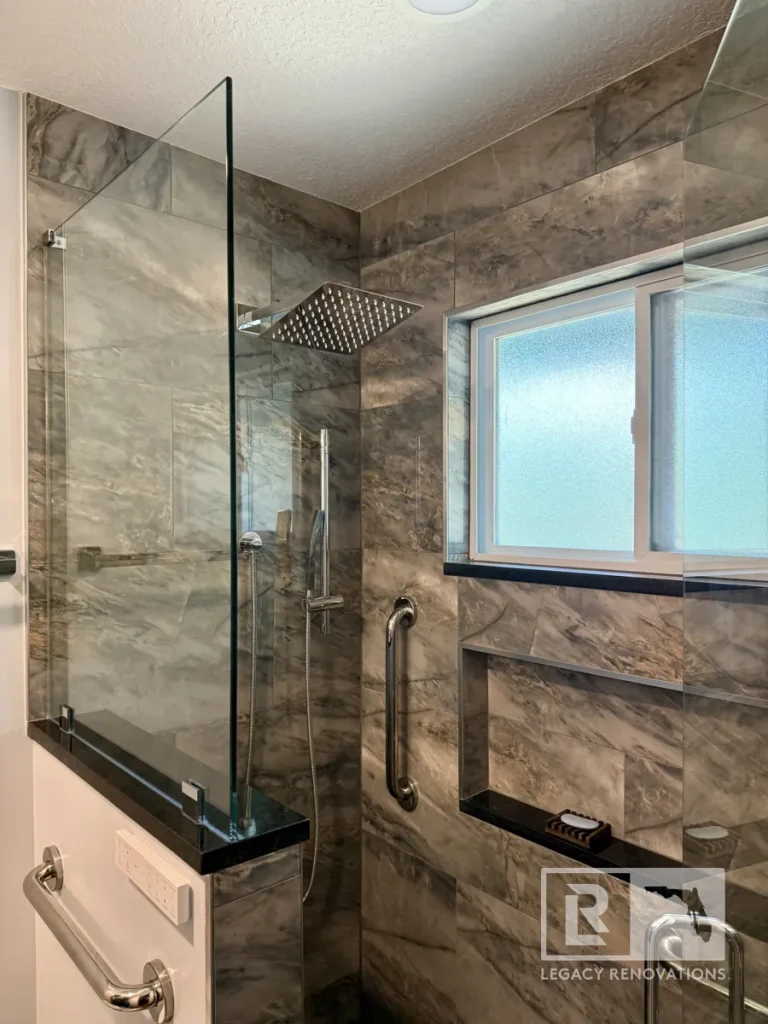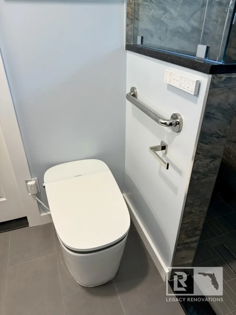 This bathroom remodel off San Pablo Road was designed with ADA accessibility in mind for an older gentleman. We customized the walk-in shower with properly placed handlebars and a new niche for functionality. A smart toilet was installed, and the vanity was completely redone to maximize storage with upper cabinets, more drawers, and custom stone. The result is a safe, accessible, and modern bathroom tailored to the client’s needs.